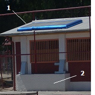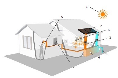 H O R M I G O N E S E L A C U M U L A D O R T E R M I C O: El concreto se usa como Batería Termosolar(2): Utiliza un bloque de Concreto (Hormigón) como acumulador del calor. Reemplaza a los estanques de agua tradicionales por un bloque de concreto (2 en la foto). Posee dos circuitos internos, uno para el agua y otro para el aire.